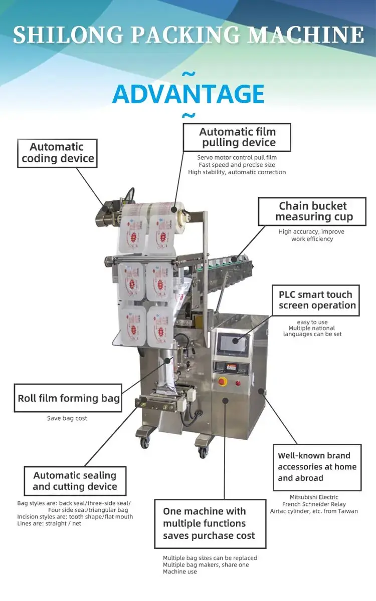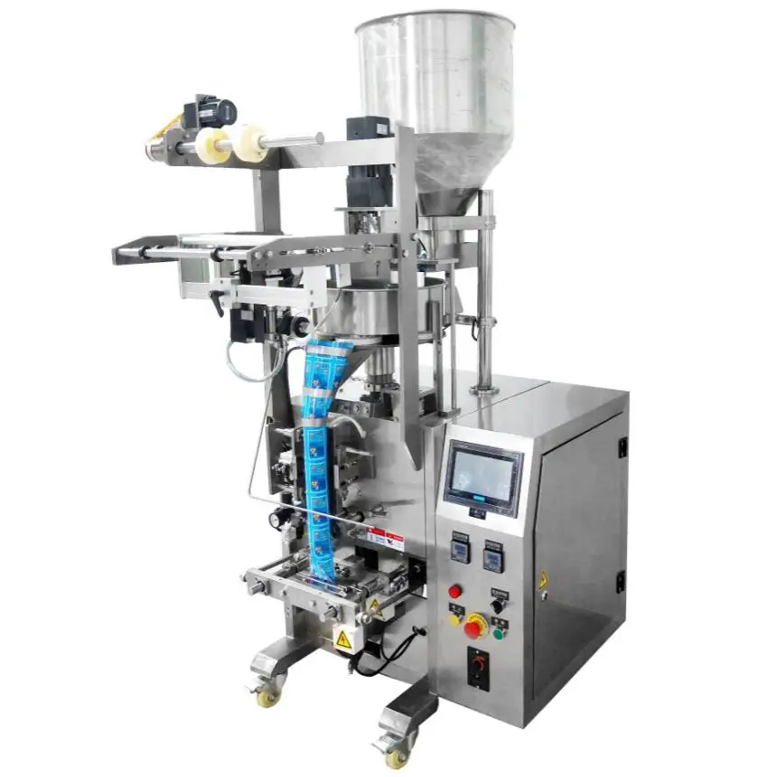 Ini adalah mesin pengepakan sepenuhnya automatik yang sesuai untuk mengemas item berbutir seperti beras, kacang-kacangan, biji-bijian, kacang tanah, gula, dan makanan ringan goreng seperti keripik kentang dan jagung bakar. Mesin ini dilengkapi fungsi pembentukan filem automatik dan pembuatan beg, pengedapan beg automatik, pencetakan kod tarikh dan sebagainya.