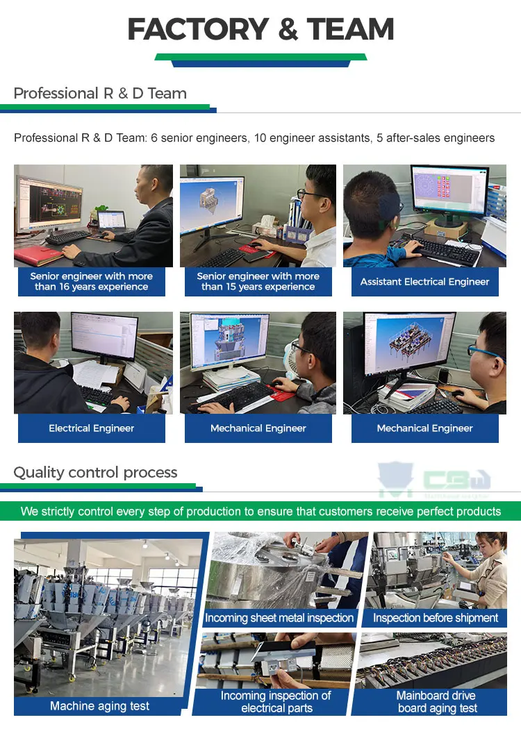 CBW >> berkomitmen dalam penyelesaian penimbangan modular berkepala banyak serta membekalkan mesin pengepakan berkaitan untuk talian pengepakan lengkap, termasuk penimbang modular berkepala banyak, penimbang modular linear, penghantar bahan, penimbang semakan, pengesan logam dan sebagainya, yang secara automatik melengkapkan keseluruhan proses dari penyuapan, penimbangan, pengepakan, pencetakan tarikh, semakan berat dan pengesanan logam.